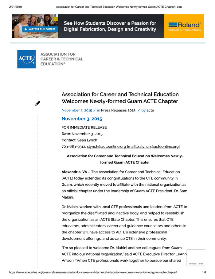 A group of local, dedicated CTE professionals helped form the new GUAM ACTE (est. 2015), an associate member of the National ACTE (see below). This incorporated organization focuses on CTE, aiming to raise awareness, promote advocacy, foster local research agenda, provide technical assistance, engage in networking activities and assist in policy development, and be a resource clearinghouse. All Directors, Officers and members are committed to high professional standards among membership; to promote regional concept through cooperation among regional island nations and affiliates; to provide a direct vehicle for input into the National ACTE; and to engage in all things necessary or proper in connection with or incidental to the foregoing purpose.