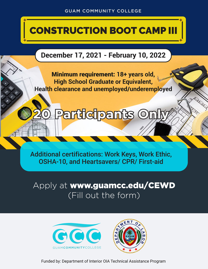 Join the Construction or Diesel Mechanic Boot Camp Now !! It's not too late to join. Go to www.guamcc.edu/CEWD or www.scnv.io/xR3L