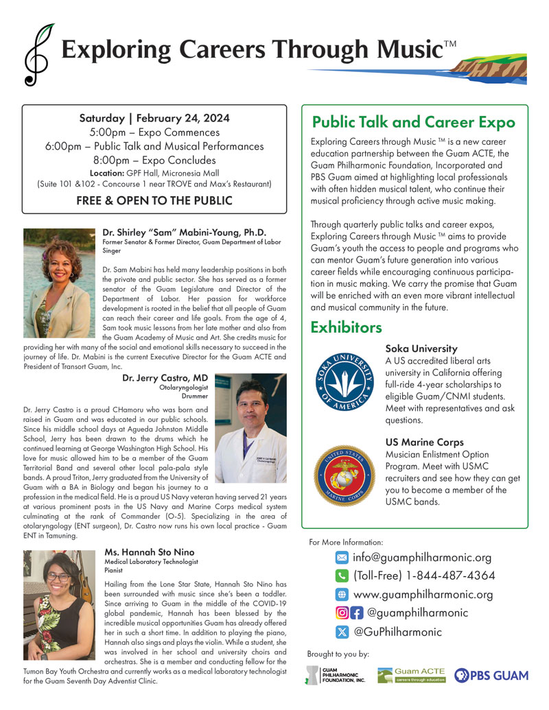In February 2024, the Guam ACTE partnered with GPF and PBS Guam to launch the first EXPLORING CAREERS THROUGH MUSIC Program.  PBS Guam will be broadcasting these shows on their station.  In the meanwhile, if you missed the event, you may listen to the PODCAST version of the February 2024 (and following May 2024) program.  Learn how music helps prepare people, like you, for many exciting non-musical careers that are rewarding and integral in our thriving community.